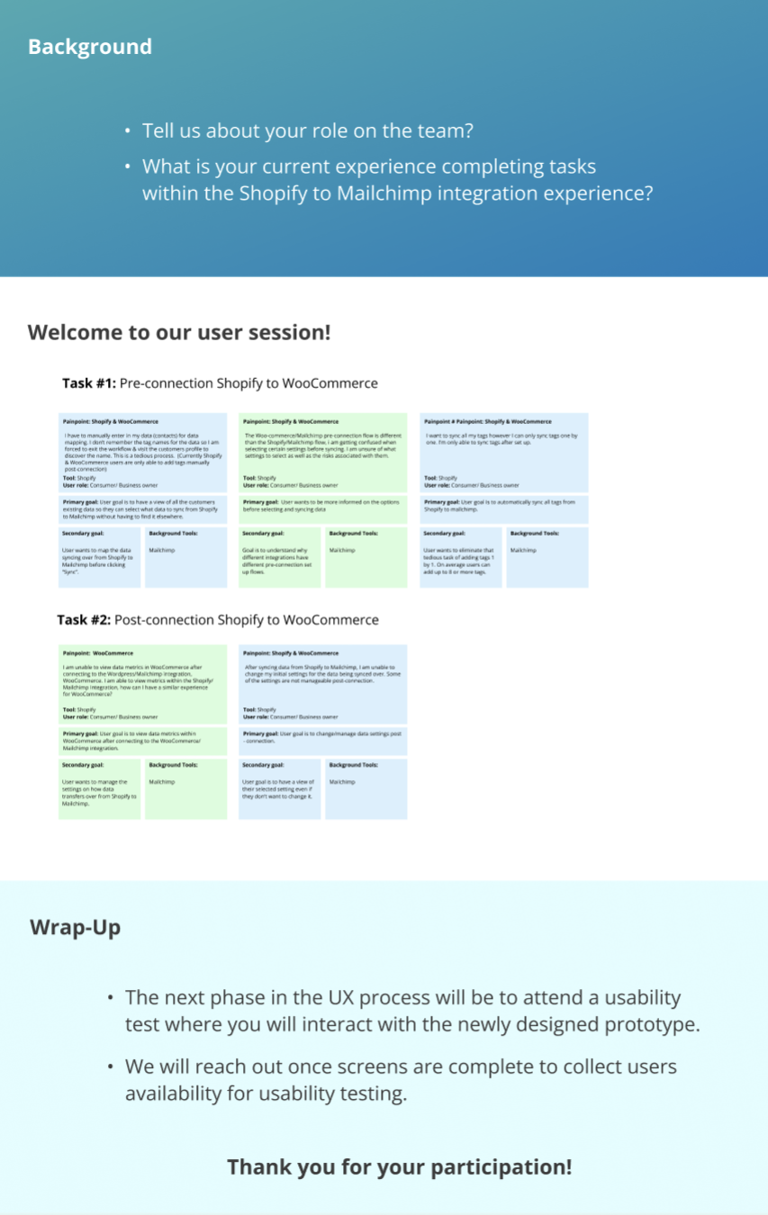 In Q4 I was assigned the task of creating pre-connection and post-connection dashboards aimed to help users sync their Shopify customer data to Mailchimp. This integration allows users to map data fields from Shopify to Mailchimp, collect additional contacts from future orders, create targeted e-commerce campaigns, generate product recommendations, and more.